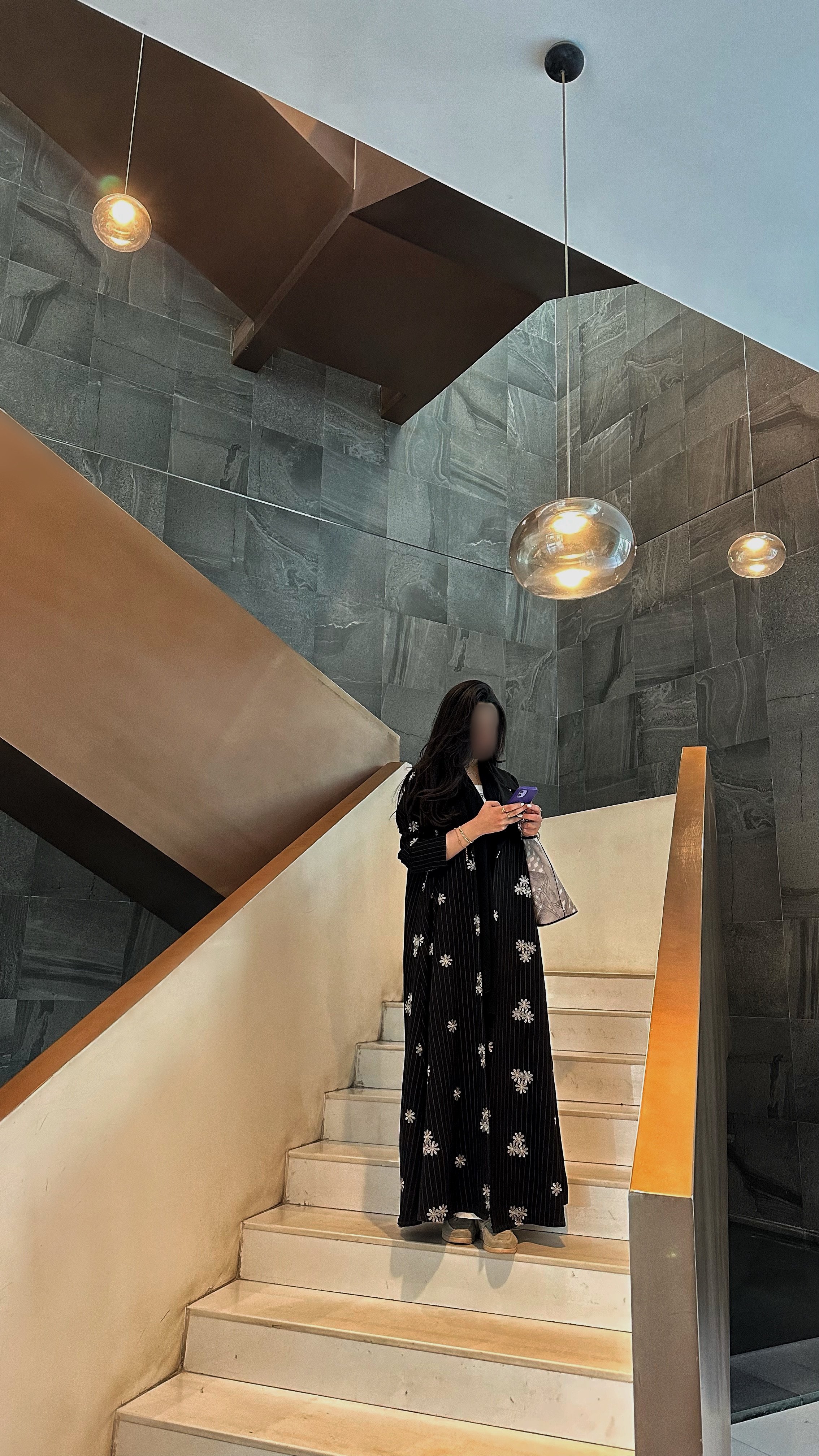 قماش / اسود مخطط مطرز بالكامل بورد التفاصيل / عبايه قصه رسميه مع ياقه اسود ساده و عبايه كامل تطريز ورد