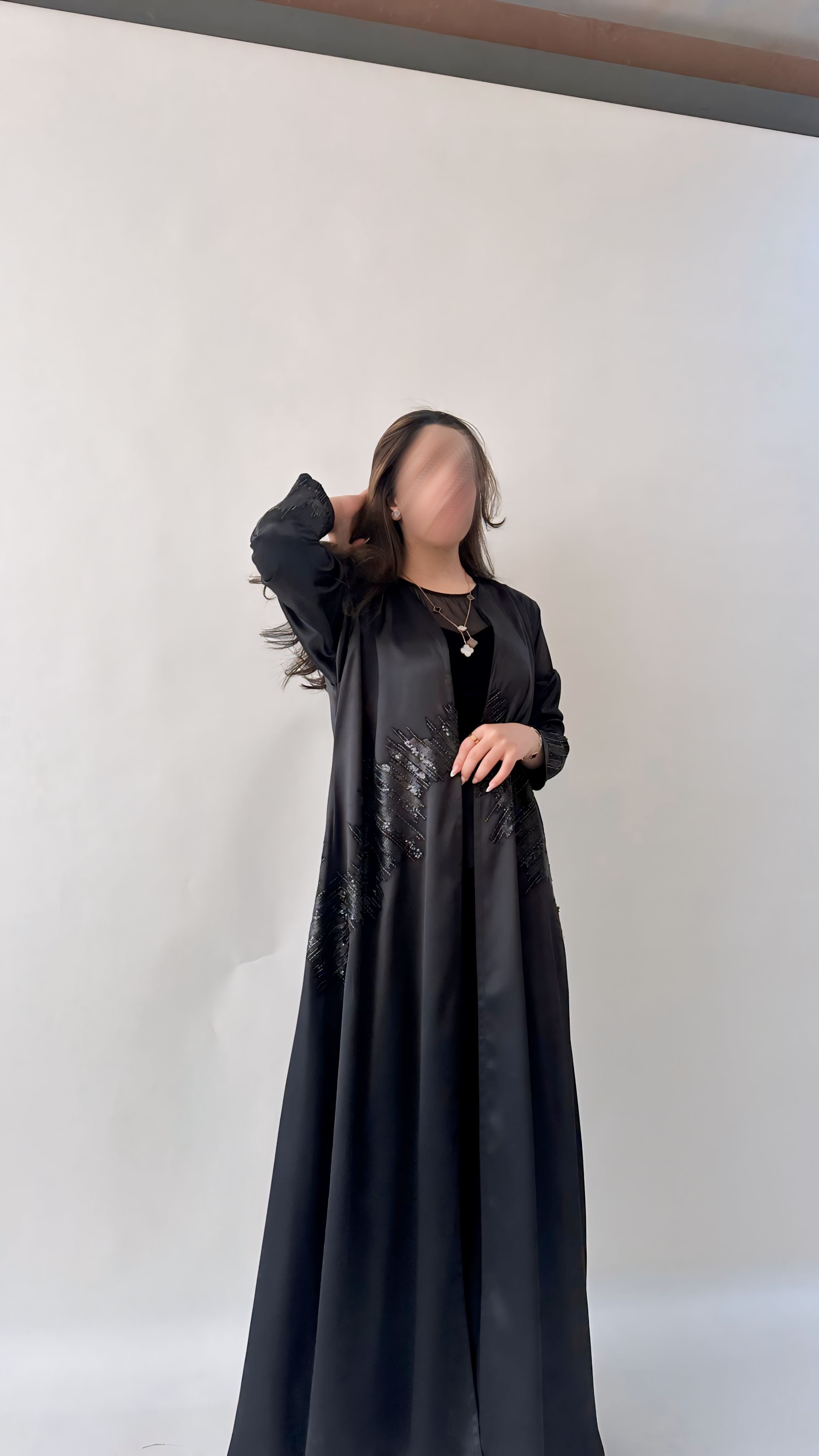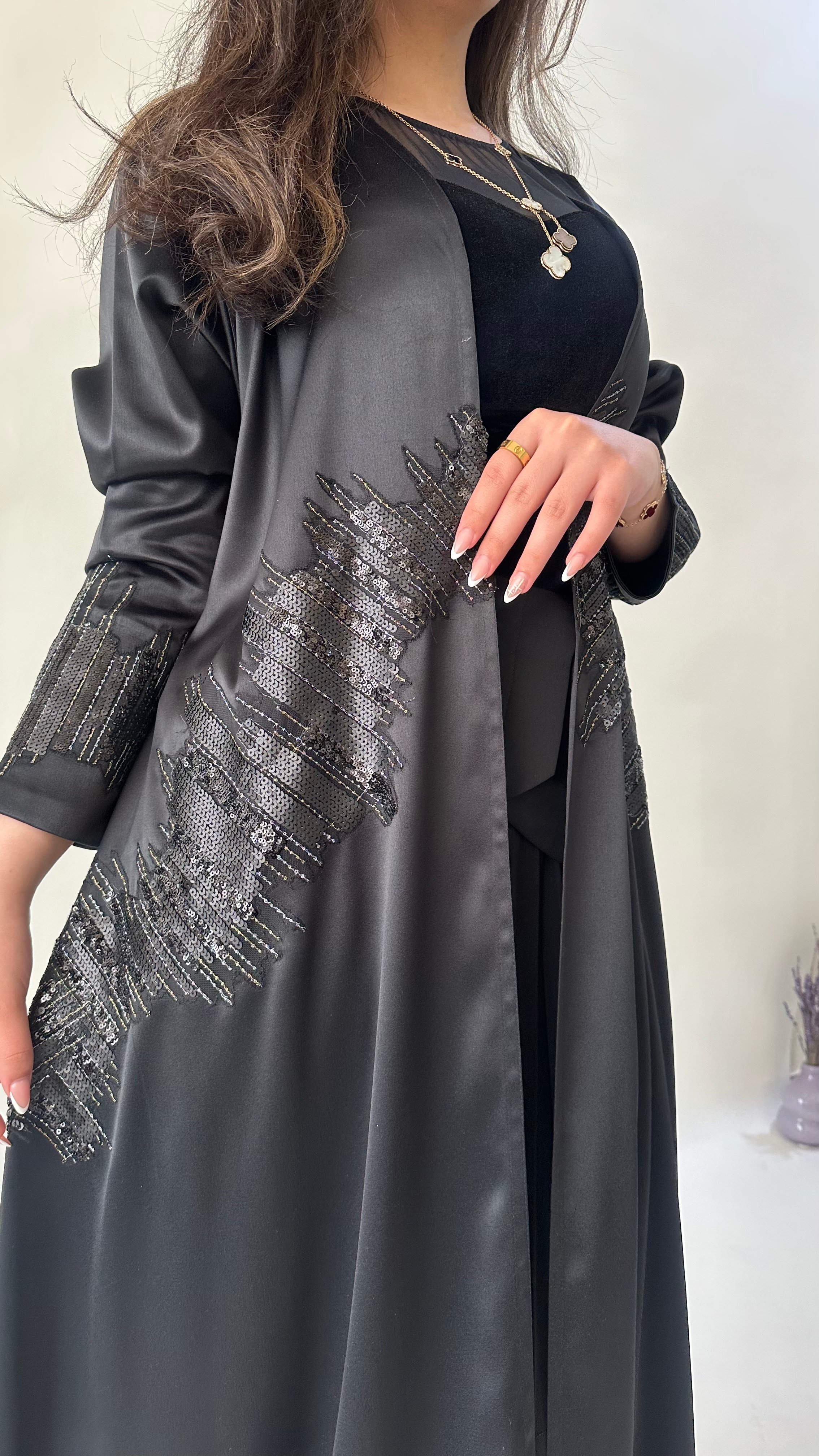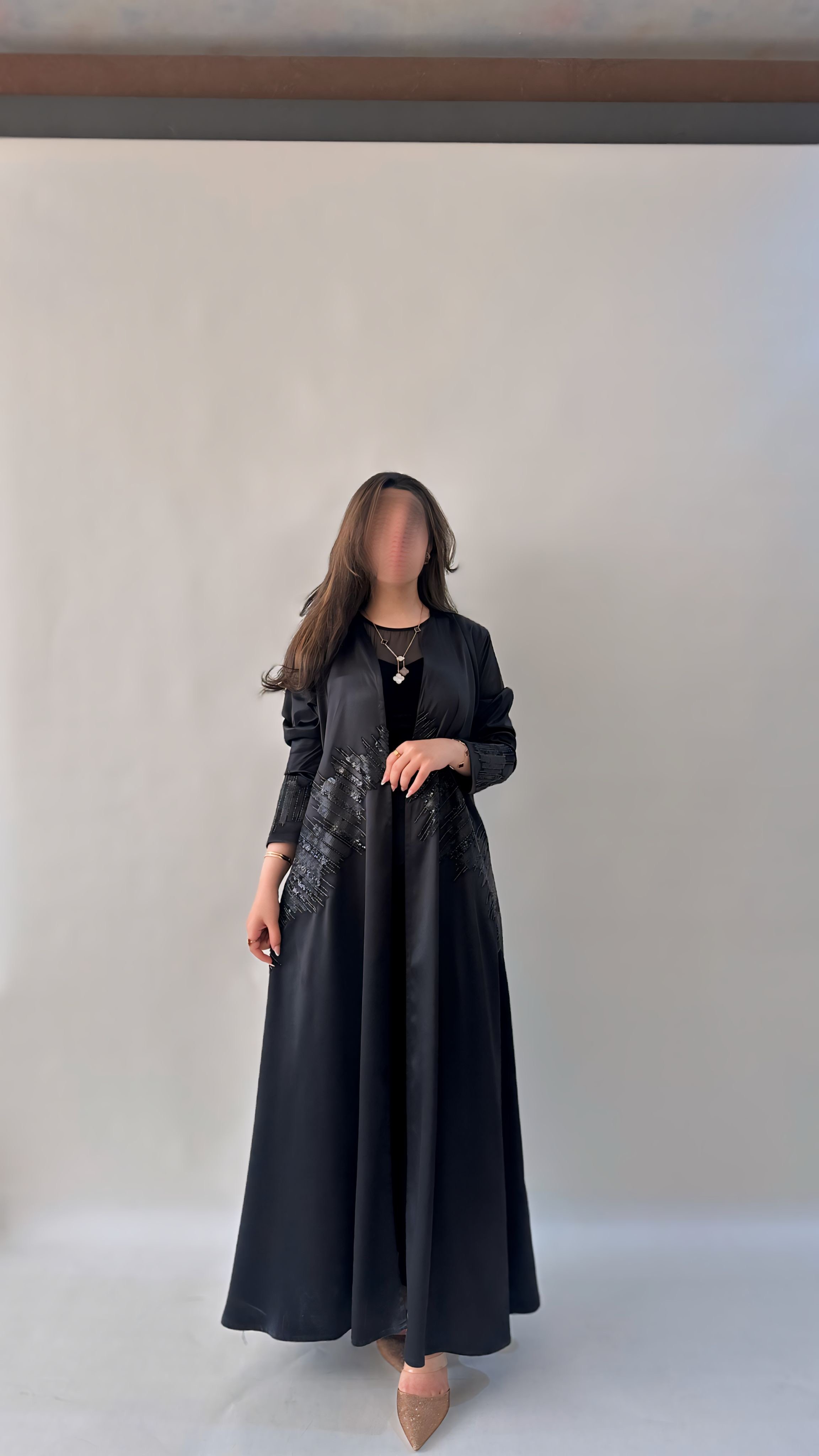 التفاصيل / قماش تفته استرتش لون اسود و شك ، قصة العبايه ربع كلوش