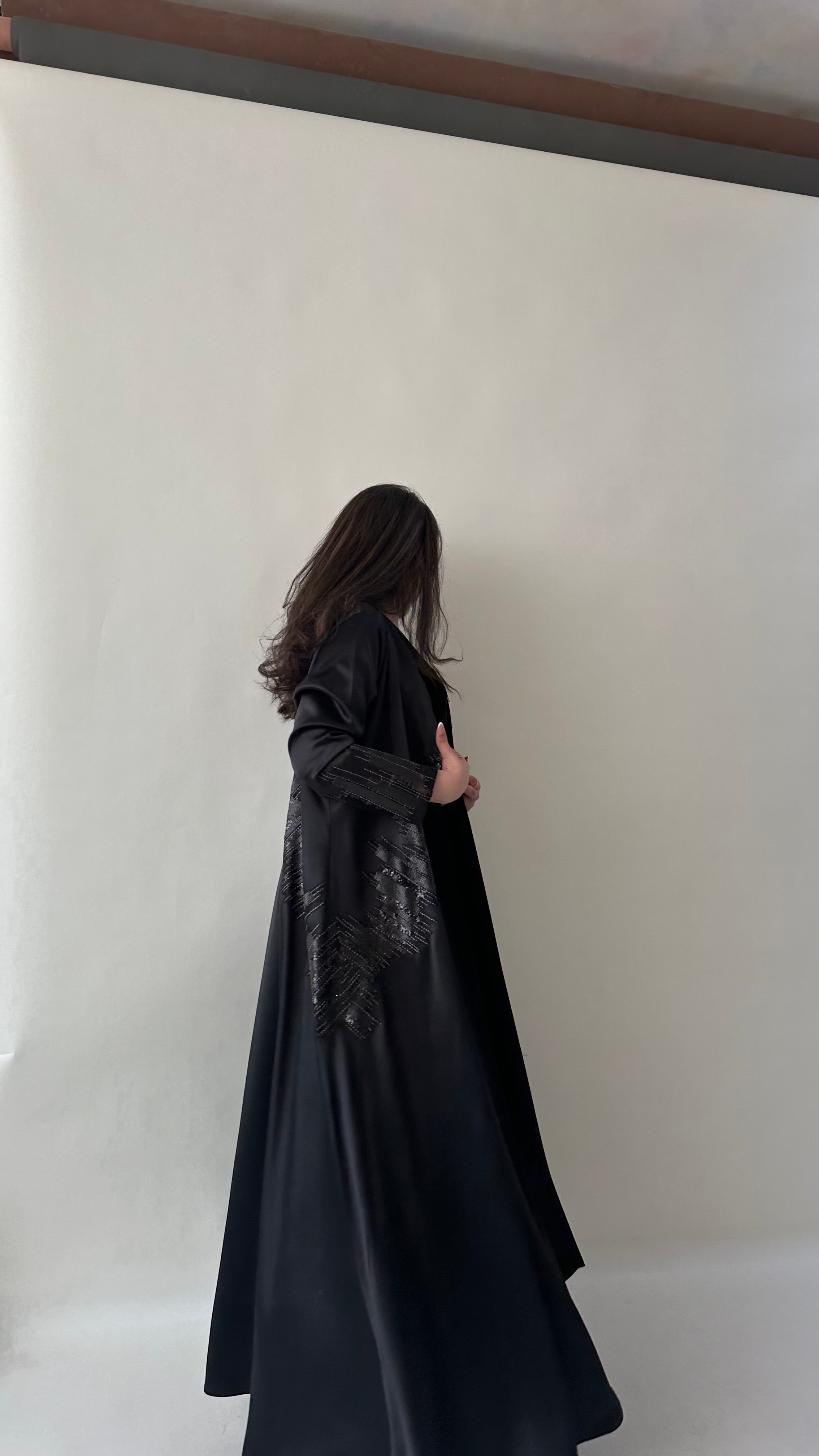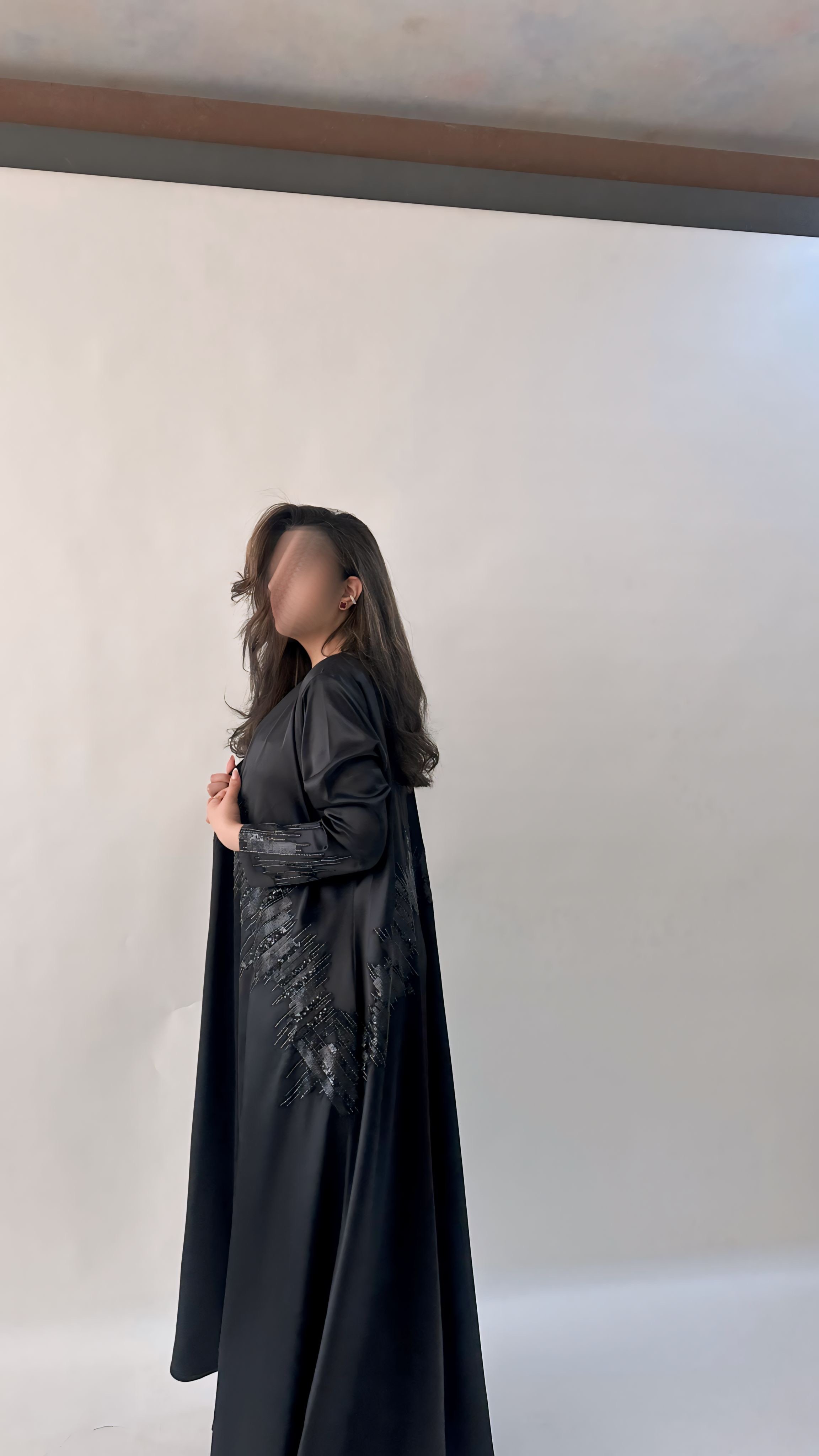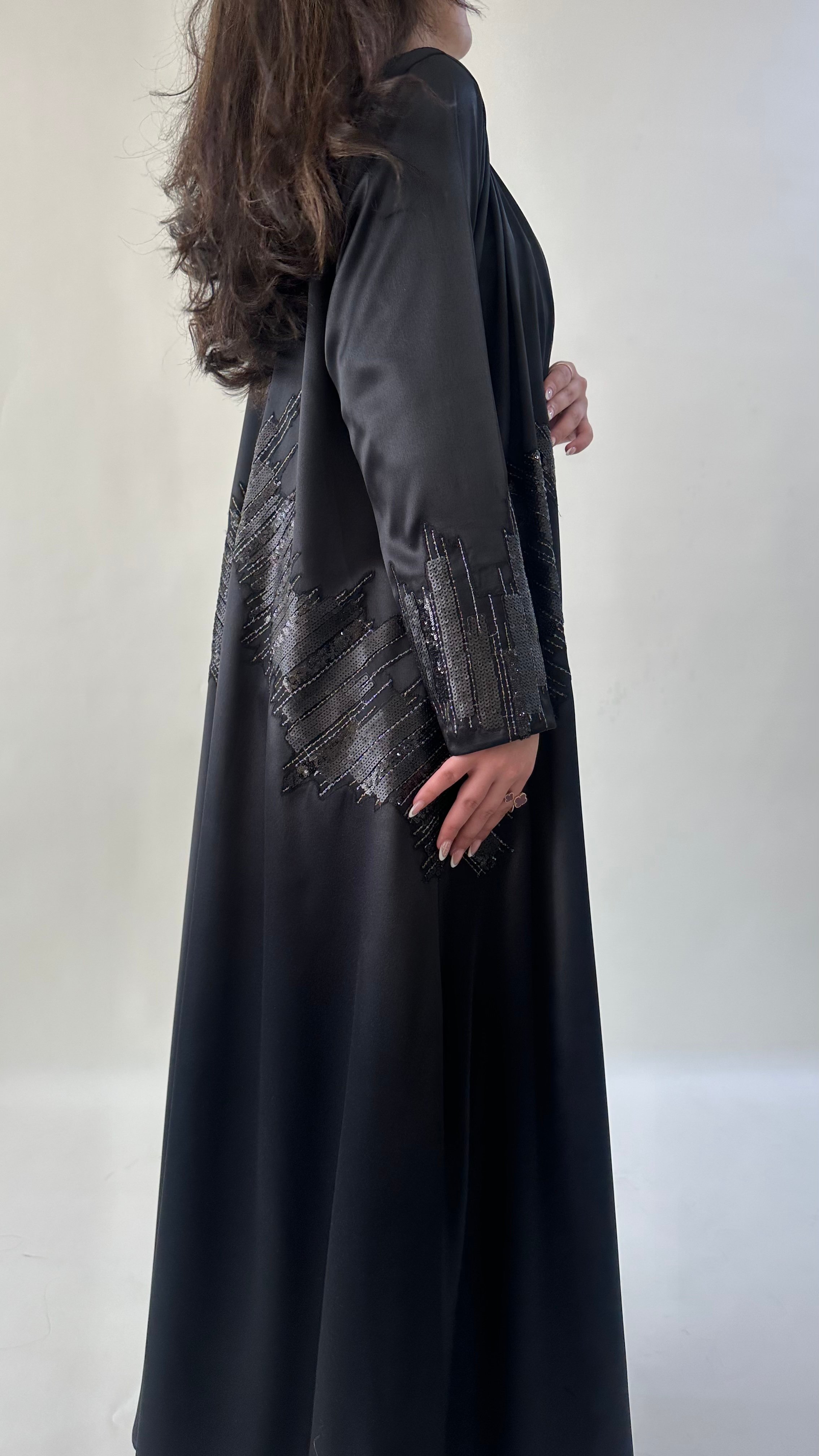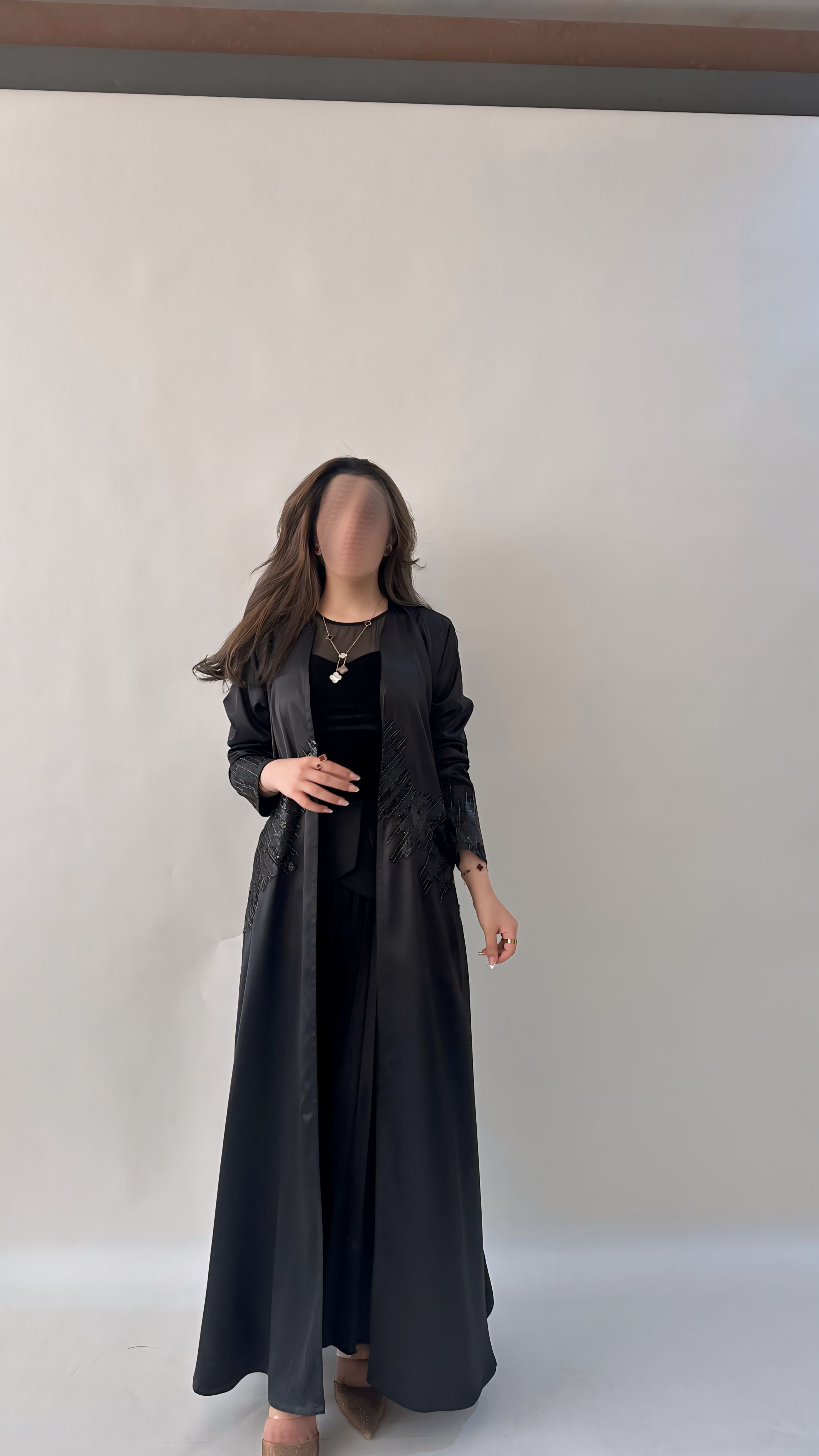 التفاصيل / قماش تفته استرتش لون اسود و شك ، قصة العبايه ربع كلوش