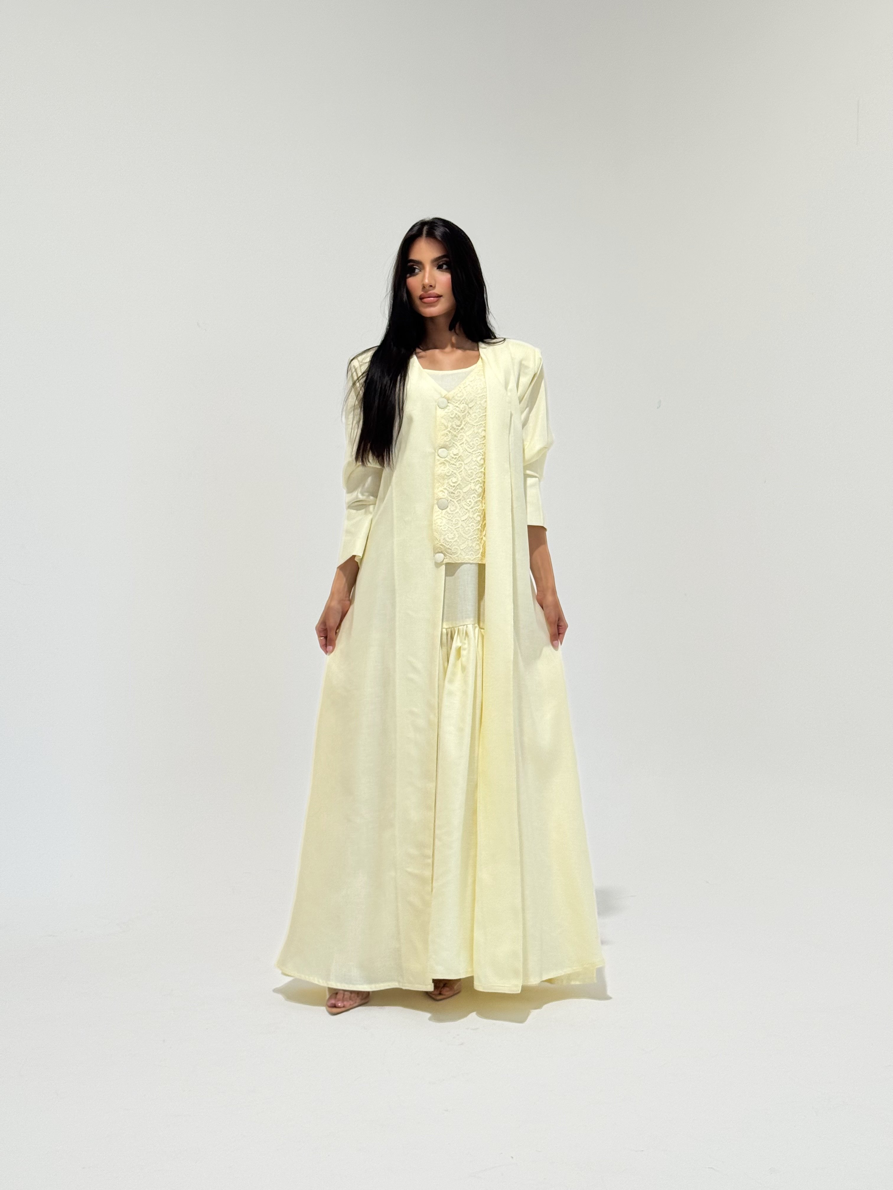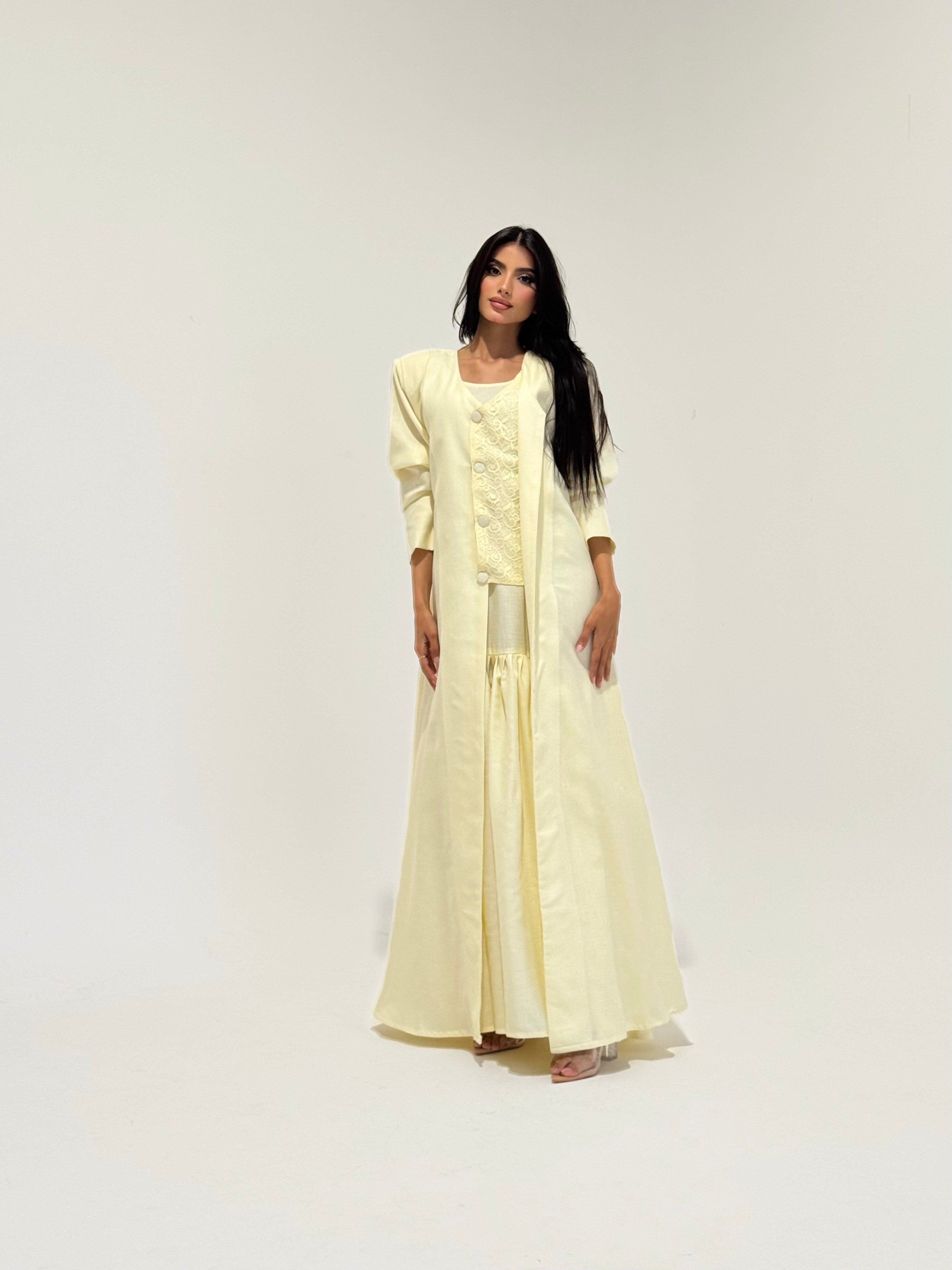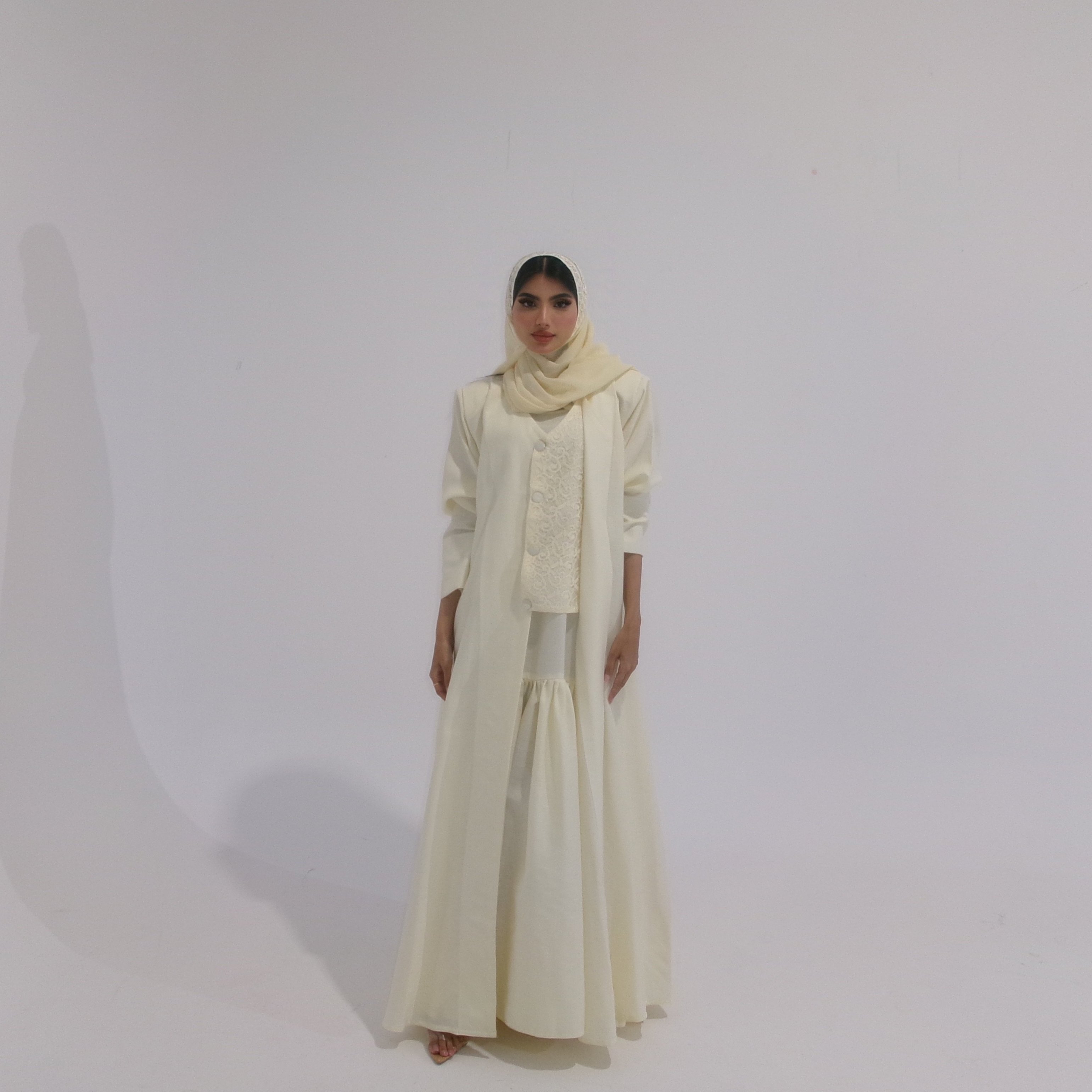 تـفـاصـيـل الـعـبـايـة / قـمـاش لـيـنـن قـصـه سـتـريـت مـع اضـافـة دانـتـيـل و آزره مـزوده بـكـتـافـات