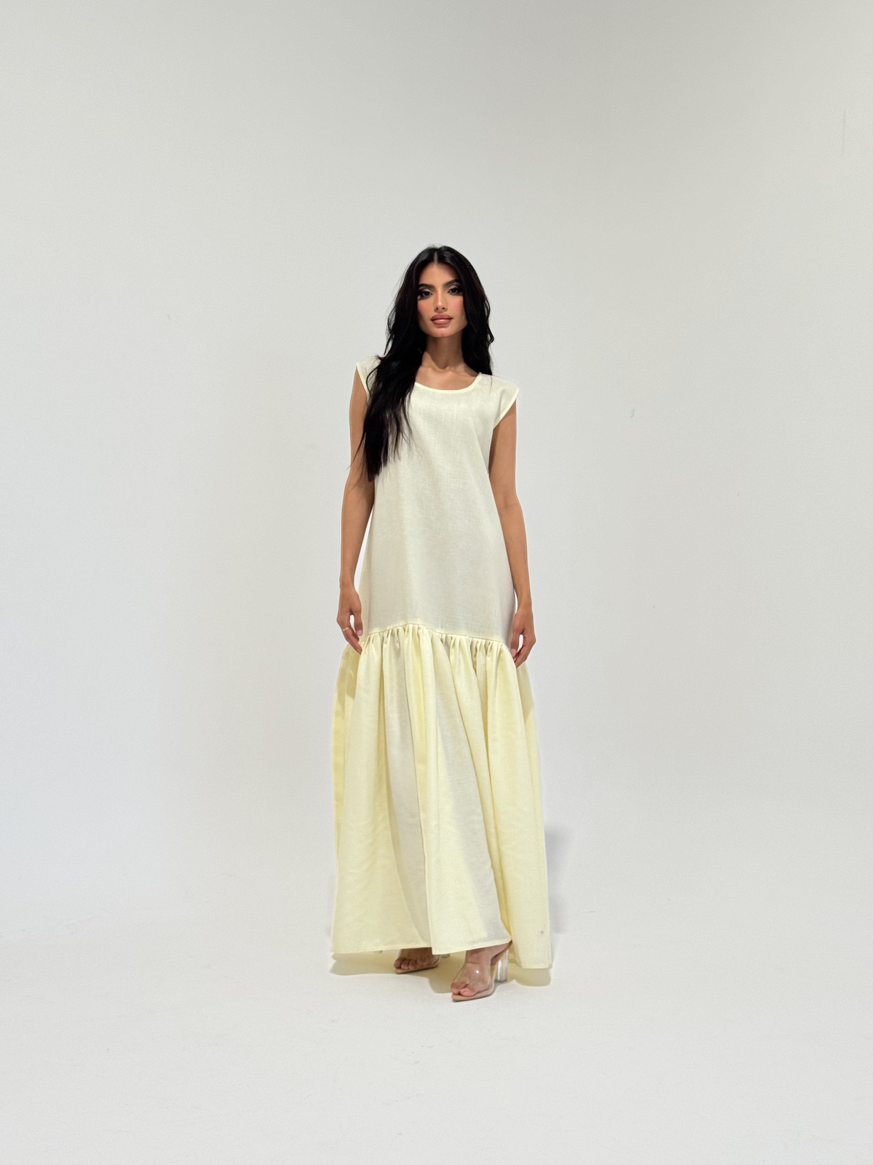 تـفـاصـيـل الـفـسـتـان / قـمـاش لـيـنـن ، بـتـصـمـيـم انـسـيـابـي انـيـق مـزود بـكـسـرات سـفلـيـة
