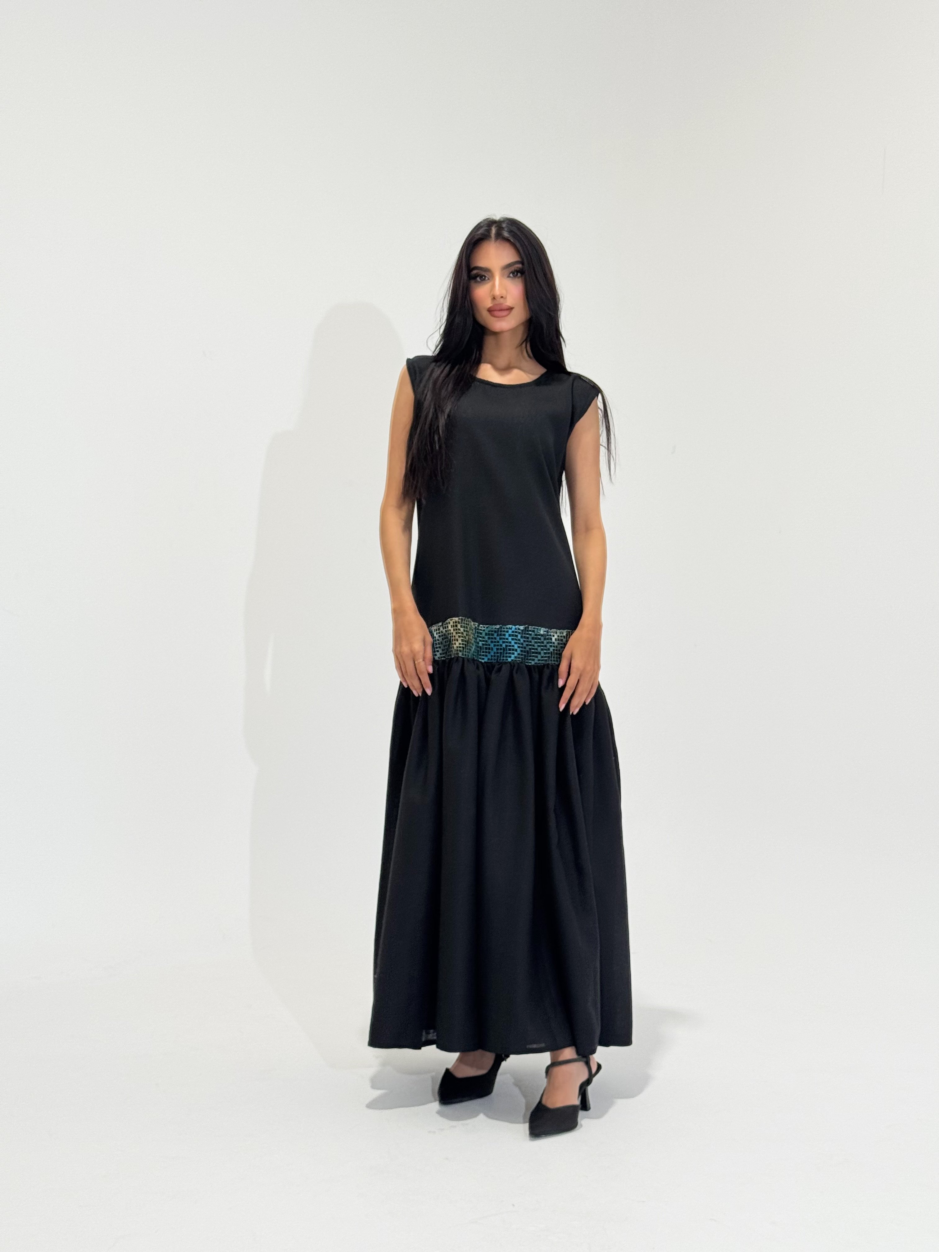 تـفـاصـيـل الـفـسـتـان / قـمـاش لـيـنـن ، بـتـصـمـيـم انـسـيـابـي انـيـق مـزود بـكـسـرات سـفلـيـة مـع اضـافـة قـمـاش فـي الـاسـفـل كـمـا مـوضـح فـي الـصـورة